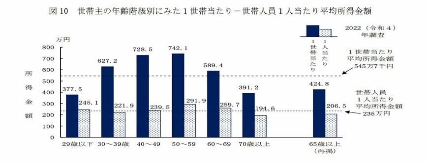 一方、世帯人員1人あたり平均所得金額をみると「50〜59歳」が291万9000円で最も高く、最も低いのは「70歳以上」の194万6000円となっています。