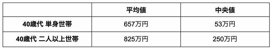 40歳〜50歳代単身世帯の中央値をみると、ともに「53万円」となっており100万円に満たない貯蓄額になっています。