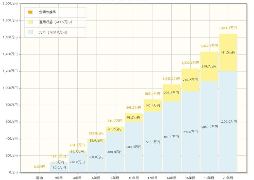 金融庁の資産運用シミュレーションを行ってみると、年率3%で運用した場合、20年間で利益は約441万円、合計で約1641万円までお金を増やすことができます。