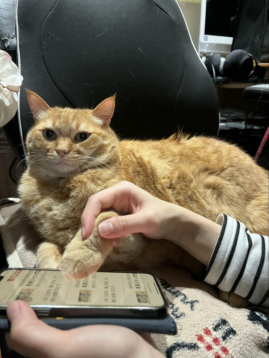 当選したいママさんは、すずくんの手を借りてスマートフォンを操作。すずくんもリラックスした様子で横たわっており、ママさんとすずくんが一緒になって当選を願っているかのようです。