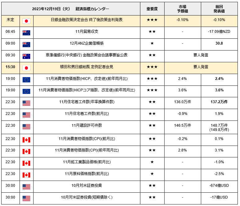 2023年12月19日(火)発表予定の経済指標カレンダーです。