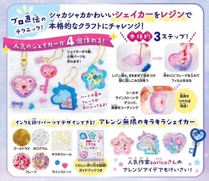 ガールズクラフトシリーズ『レジンで作る ミラクルシェイカー』は、シャカシャカシェイカーのアクセサリーを4個つくるのに必要な、レジン液やデコパーツ、シリコン型、ボールチェーンなどの材料が、全部入っています。