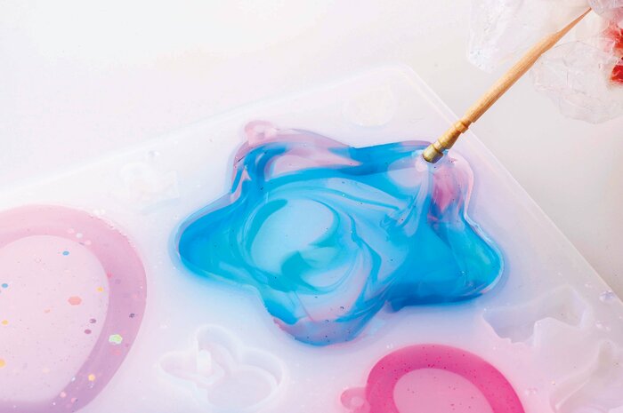 もちろん、単色で使っても可愛いのですが、この2色を混ぜて自分だけのお気に入りの色を作ったり、グラデーションやマーブルなど、オリジナルのカラーリングのレジンにアレンジしたりすることもできます。