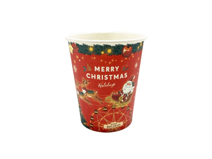 「MERRY CHRISTMAS」というメッセージとサンタクロースがプリントされた、クリスマス専用の紙コップです。ジュースやシャンメリーをこのコップに注いで乾杯しましょう。