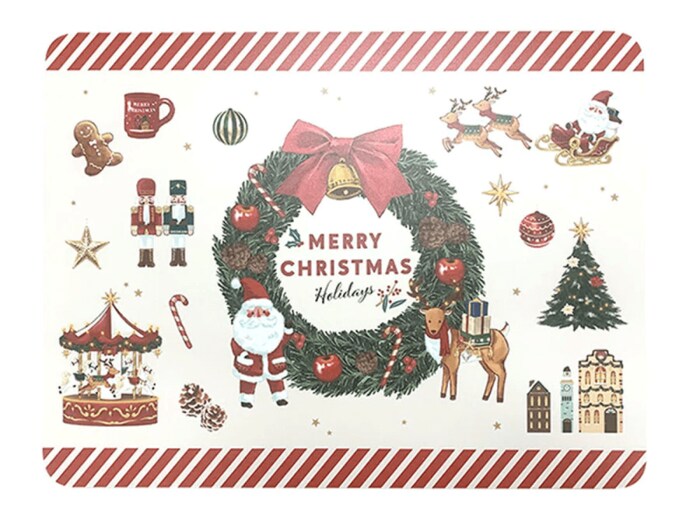 サンタクロース、トナカイ、クリスマスリース、ツリー……。クリスマスならではのイラストが描かれたこのランチョンマットを使うだけで、クリスマスディナーがさらにゴージャスになるはずです。