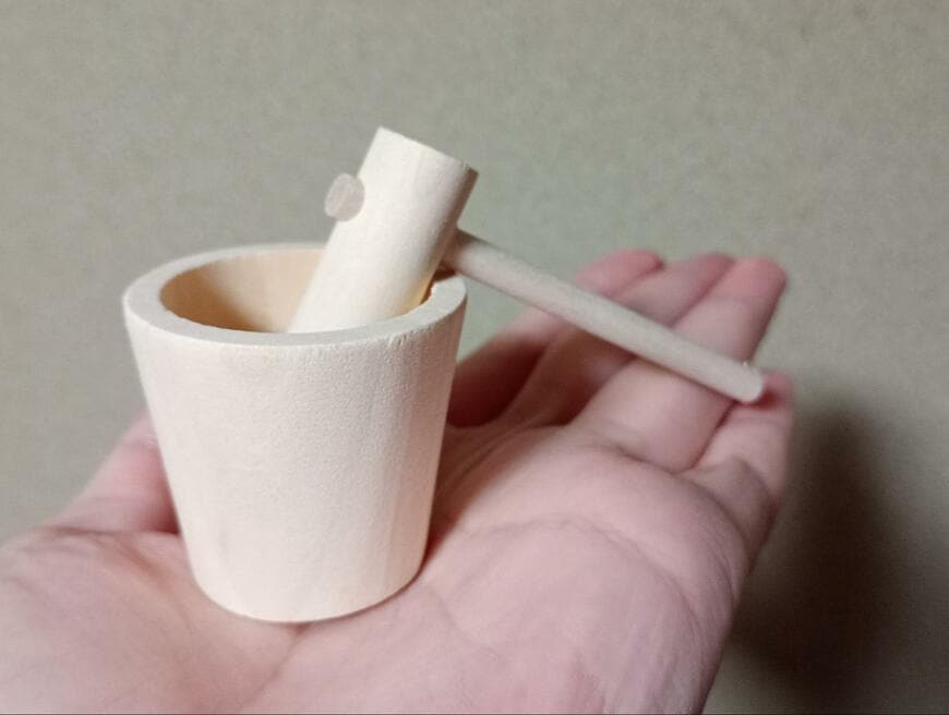 2. セリアの「木製オブジェ杵と臼」は、手のひらサイズです! ちょっとしたスペースに飾ることができちゃいます