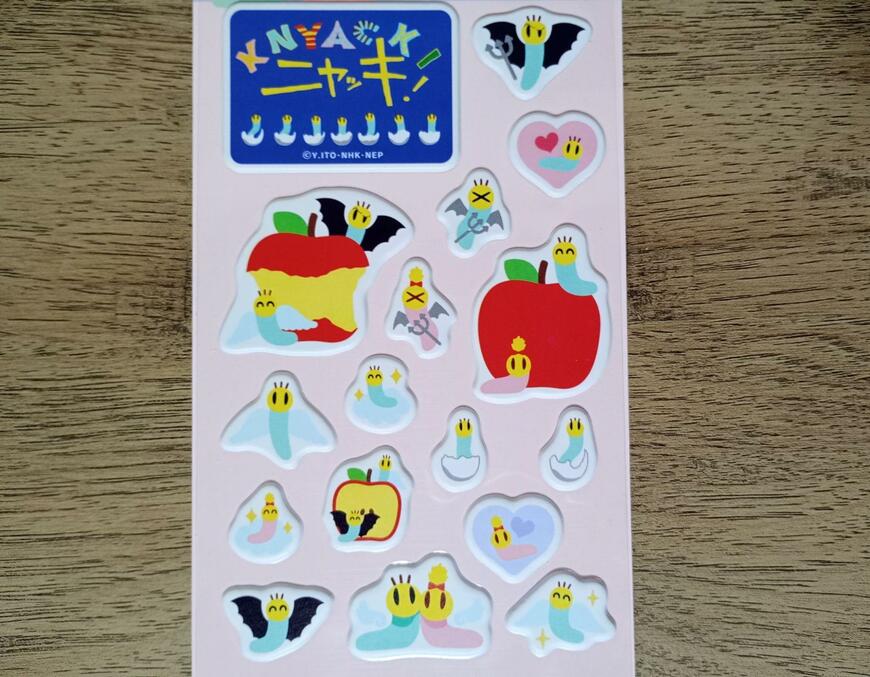 ニャッキやピンクちゃん、タイトルロゴがデザインされたシールです。写真のように、2種類展開となっています。