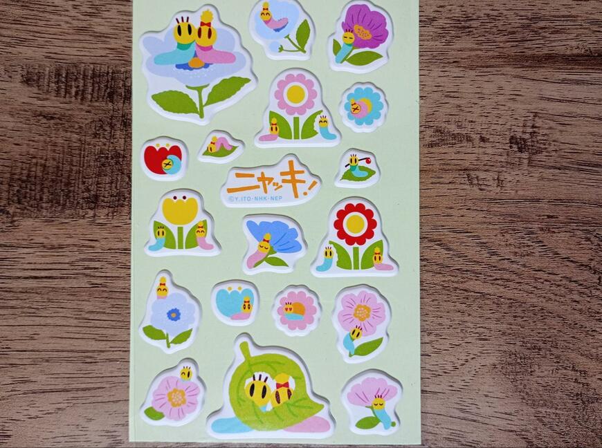 ハート型の穴が開いた葉から、ニャッキとピンクちゃんがこちらを覗いているシール(横幅約4cm)など、素敵なデザインのシールがそろっています。