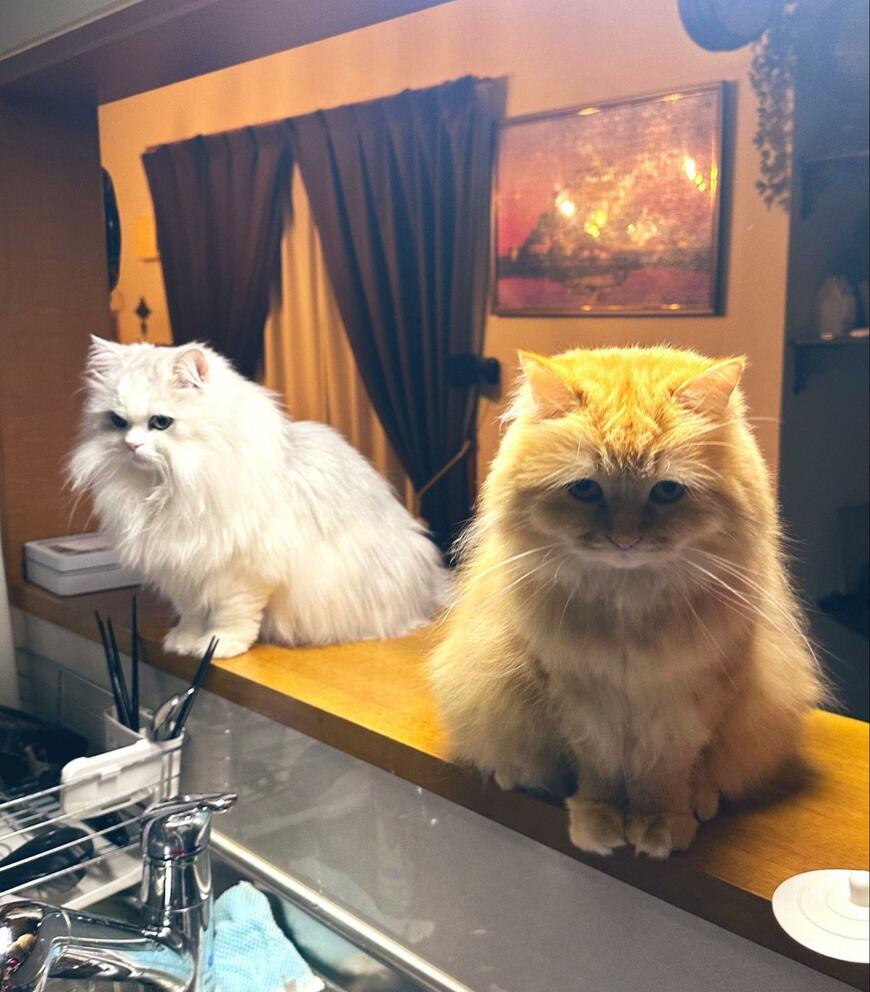 Xでたくさんの注目を浴びているのは二匹の猫ちゃん。左にはノーマンくん、右にはエマちゃんの姿があります。帰宅後に何気なく「オヤツ」と発した飼い主さん。するとそれを耳にした二匹は、呼ばれたかのようにカウンターの上に集合しています。
