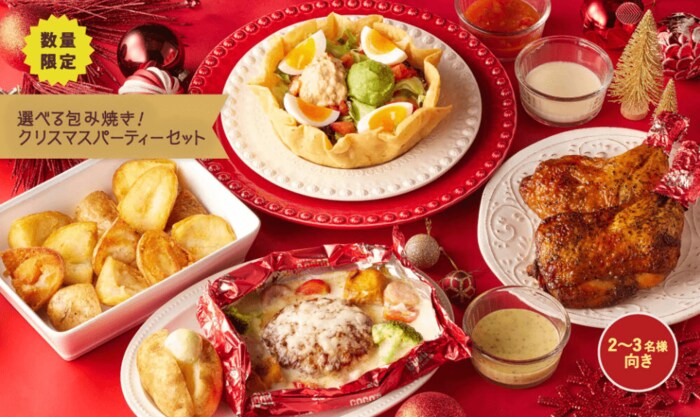 メインはクリスマスローストチキン2本と、包み焼きハンバーグの2~3名向けのパーティーセットメニューです。肉汁があふれ出す包み焼きハンバーグは、チーズフォンデュ風か濃厚ビーフシチューの2種類から選べ、大きめの野菜も一緒に入っているので食べ応えも抜群。
