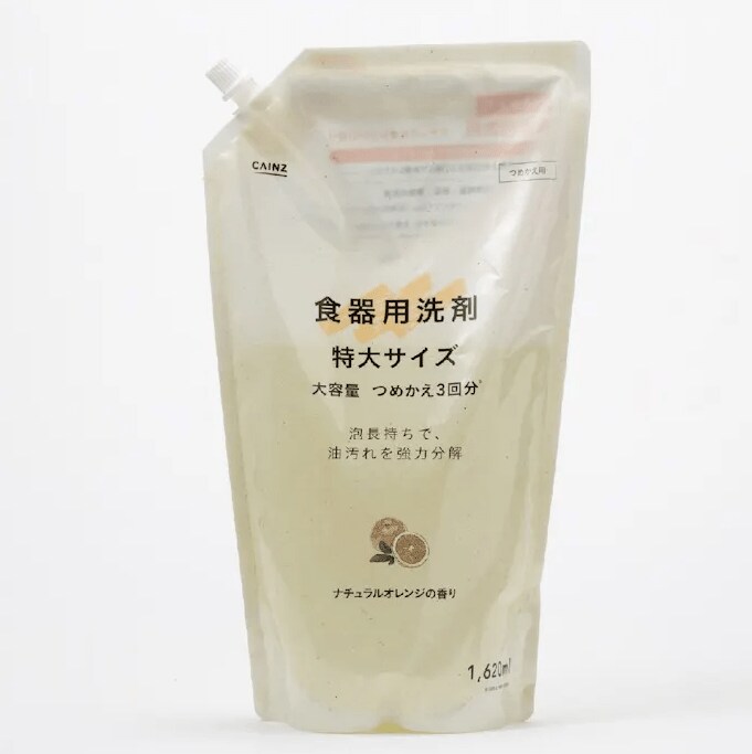 詰替用の食器用洗剤は、1620mlと大容量でありながら、なんと248円(税込)という驚きのお値段!食器や鍋、フライパンなどの調理器具のほか、野菜や果物の洗浄にも使える優れものです。