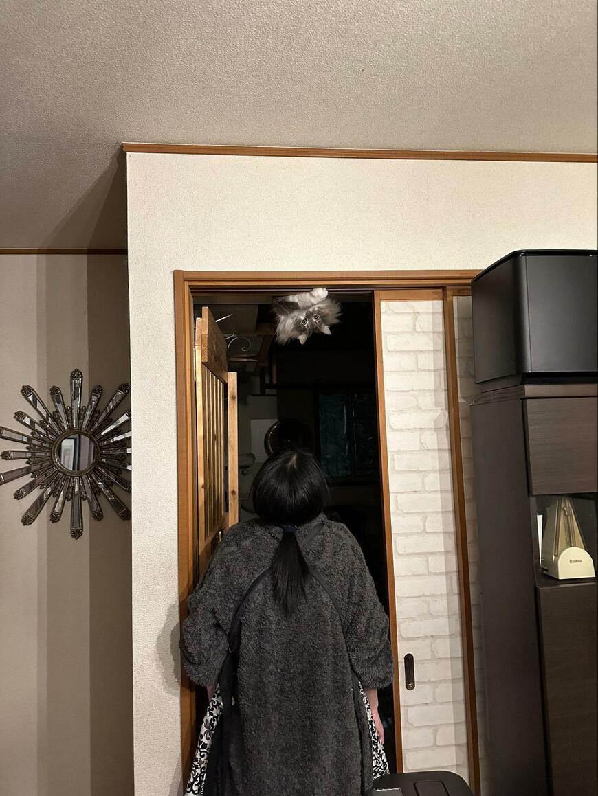 写っているのは天井を見上げるママさんの後ろ姿。そしてその視線の先には……?向かいの部のドア上部から、逆さまに生えてきたような格好で覗き込む猫ちゃんがいます。