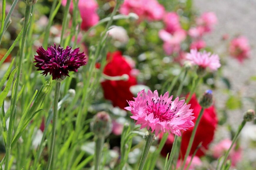 ピンクやパープル、ブルーの花色がオシャレなヤグルマギク。野趣あふれる雰囲気で、特にブルーの花色は爽やかな印象です。