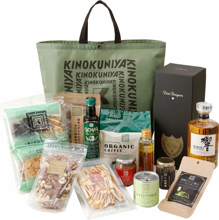 - セット内容:8種の彩りおかきセレクト、大粒ナッツミックス 徳用、国産うずらのたまご 味付け燻製風味、GOYAオーガニックEXVオリーブオイル、焼チーズサラミ(大袋)、オーガニックドリップコーヒーオリジナルブレンド14P、福岡県産あまおう®いちごバター、贅沢な卵かけトリュフしょうゆ、シャインマスカット缶詰、牛肉佃煮、貴腐ワイン漬けレーズンチョコビター、ドン ペリニョン’13、響 JAPANESE HARMONY、カラーエコスペシャル(グリーン×ブラウン)(各1点)
