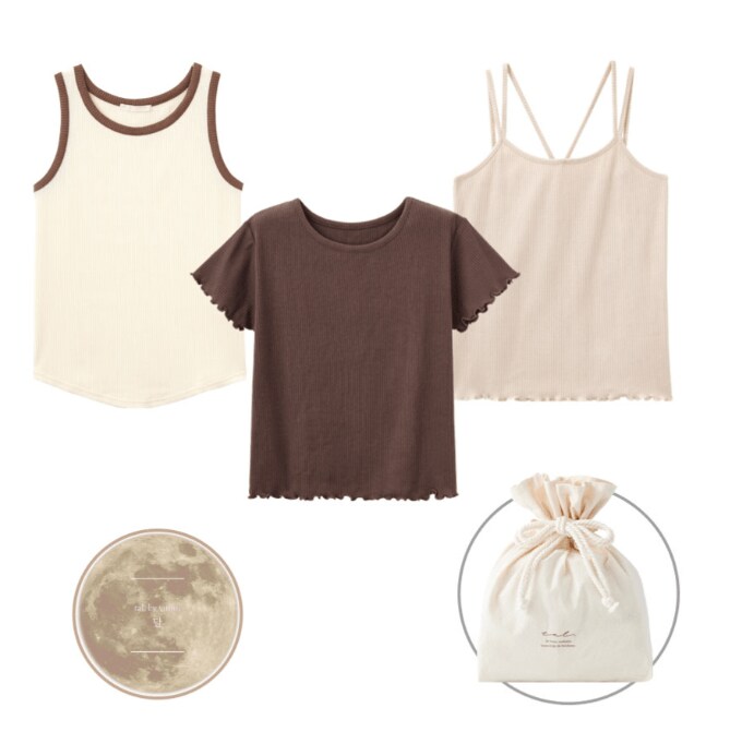 - 素材:(タンクトップ)ポリエステル62%・綿34%・ポリウレタン4%、(キャミソール)ポリエステル62%・綿34%・ポリウレタン4%、(半袖Tシャツ)ポリエステル62%・綿34%・ポリウレタン4%、(巾着袋)綿100%