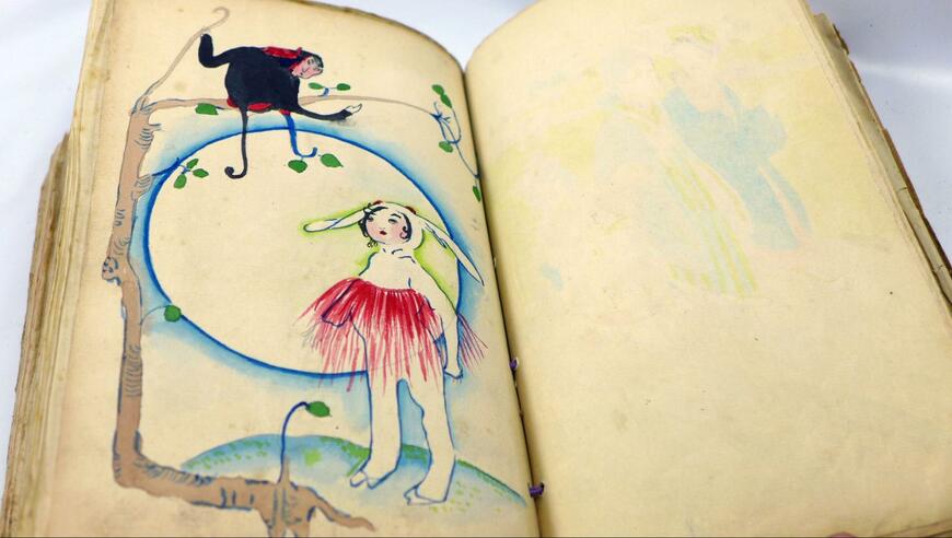 同人誌の中身を見てみると、丁寧に描かれた漫画やイラストが残っているのが分かります。こちらは木に登る猿と、動物のような服を着た女の子でしょうか。かわいらしい絵柄が印象的です。