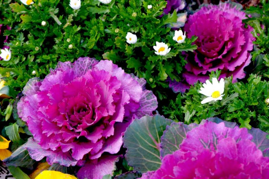 ハボタンはキャベツのような形をした冬庭の定番植物。紫や黒などシックなダークカラーの品種も続々登場しています。