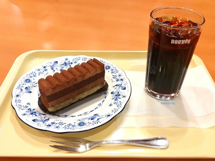 注文からまもなくチョコムースケーキが到着。急ぎ足でドトールに来て体が温まっていたこともあり、今回はアイスコーヒー(ブラック)を一緒に注文しました。