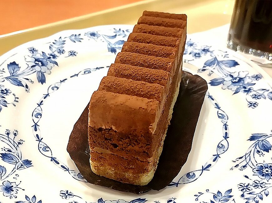 ムースやスポンジなどが4層に重なり、縦長にカットされています。小ぶりでかわいらしいビジュアル。カカオの香りがふんわりと漂ってます。