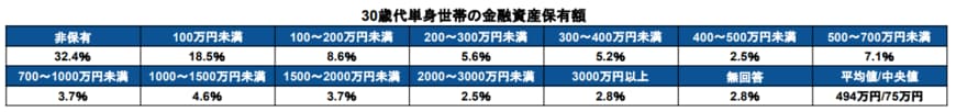平均値は494万円・中央値は75万円です。貯蓄ゼロの世帯の割合も32.4%と高く、30歳代単身世帯の多くは二人以上世帯よりもさらに貯蓄がない状況となっています。