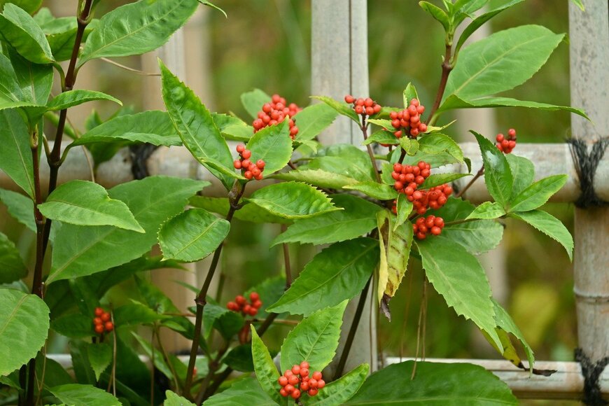 お正月の枝もの、切り花として出回るセンリョウも縁起モノ植物として人気があります。植木でも出回るので、お正月のあいだは鉢に植えて、玄関先に飾っておくのもよいでしょう。