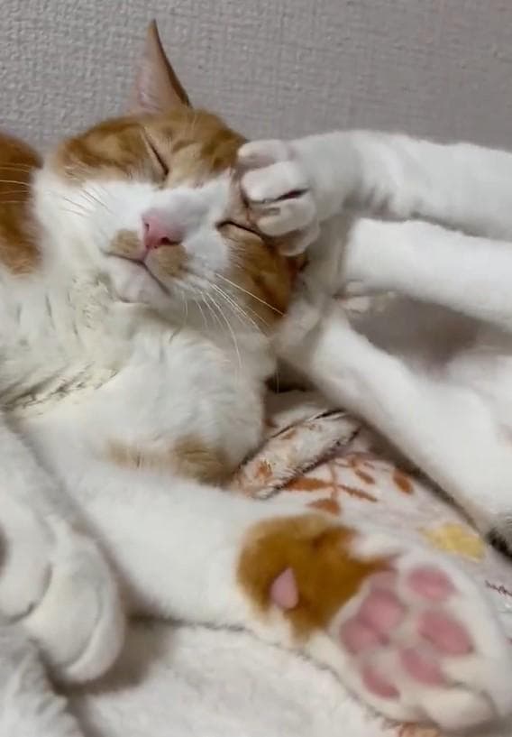 つくしくんの両手足が、きなこくんのお顔に密着。しかしきなこくんは、どれだけふみふみされても微動だにせず目を細めています……!