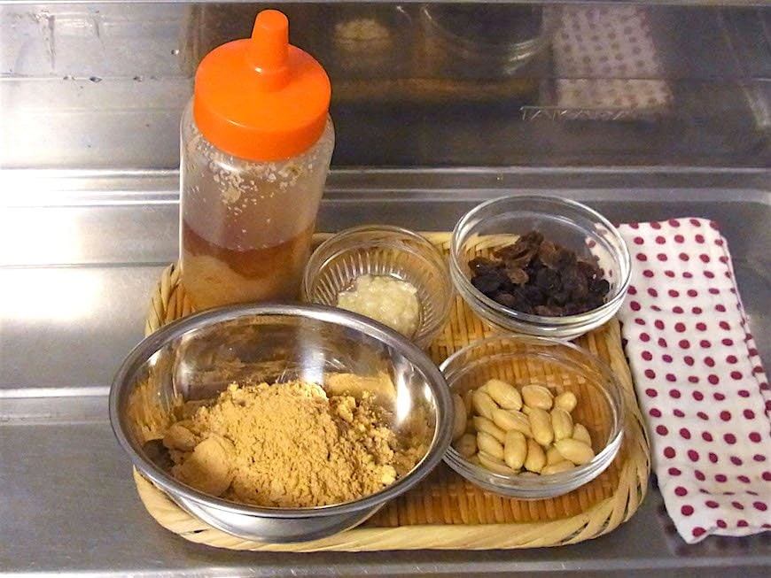 さて、ここで使ったきな粉が少し余りましたよね? なのでもう一品は、昔懐かしいきな粉棒を作ります。文字通りきな粉とハチミツを混ぜて固めるだけなのですが、ここにナッツとレーズンを加えるとちょっと大人っぽい味になるのが不思議! 塩麹も加えて、さらに旨味アップですよ〜!