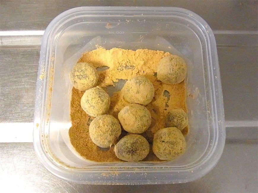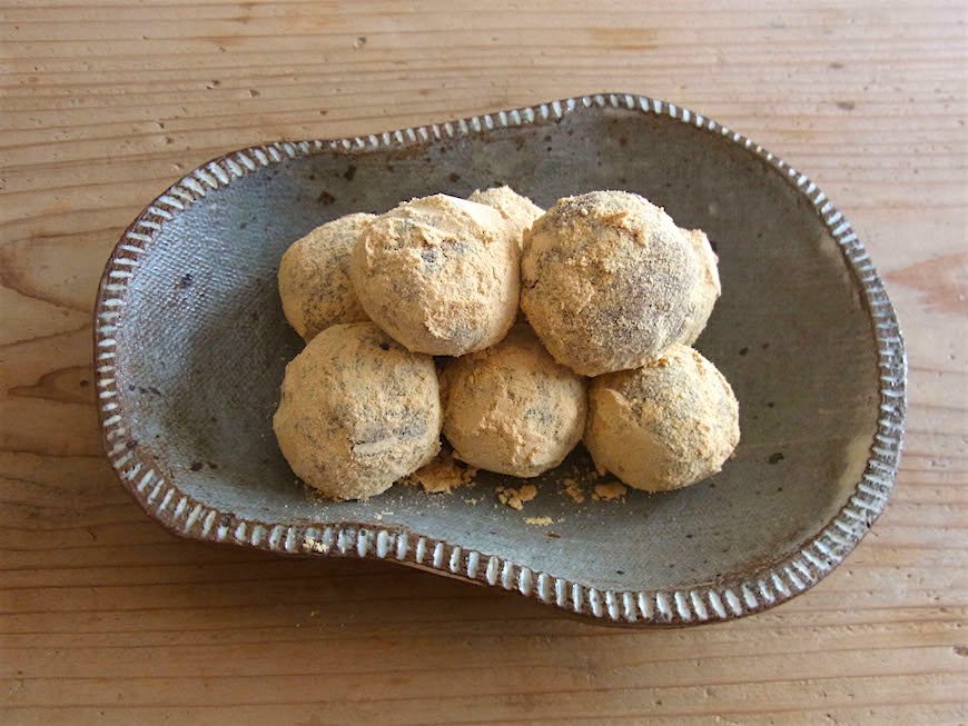 - 成形しやすい硬さになるまで冷まし、手で丸め、きな粉をまぶして冷やし固める。