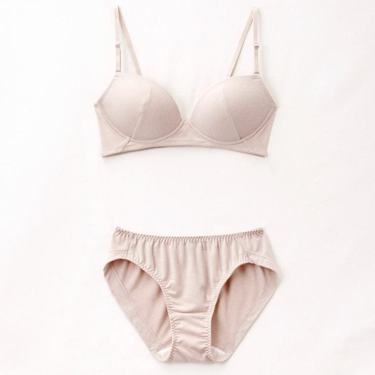 ノンワイヤーブラジャーとショーツのセットです。ノンワイヤーなので、自然な付け心地でバストを支えてくれます。ショーツも足口部分は生地を折り返した仕様になっています。ゴムの締め付けを感じにくいです。