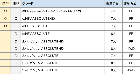 まずはグレード構成の違いです。新型オデッセイのグレードはe:HEV 搭載車のみで全て7人乗り。2.4Ⅼガソリンエンジン車がなくなって非常にシンプルになりました。