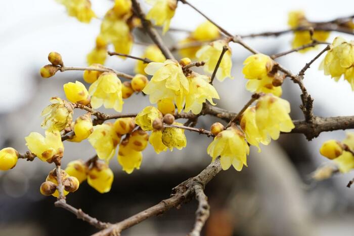 梅に似た花姿と開花時期から「蝋梅」と名付けられましたが、ウメとは異なるロウバイ科の植物です。黄色の梅のような見た目で、見ていてとても癒されます。