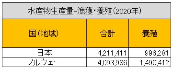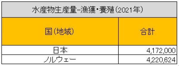 日本の2020年・水産物生産量(漁獲・養殖)は、約421万トンで養殖が約99万トンとなっています。ノルウェーは約409万トンで、養殖が約149万トン。2020年時点では日本の方が多いのですが…。