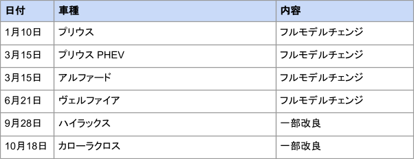 のフルモデルチェンジと「カローラクロス」「ハイラックス」の一部改良です。