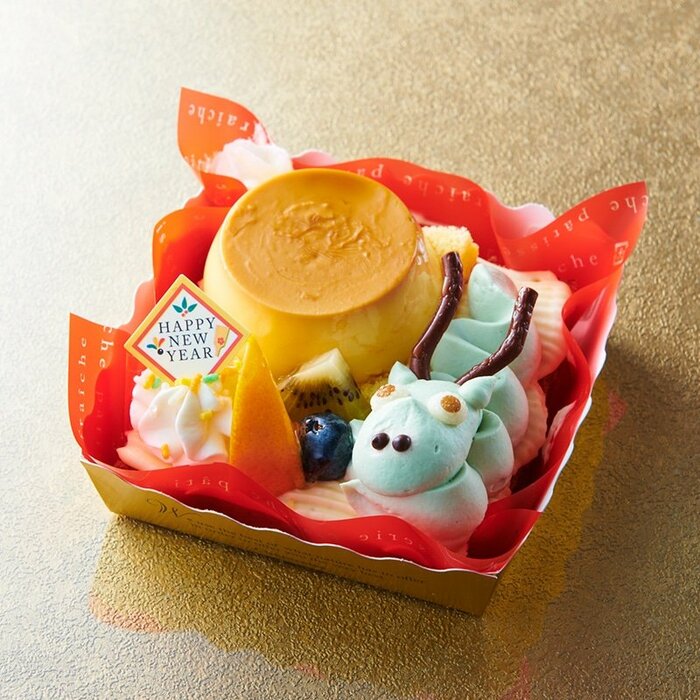 2024年の干支「辰」が新年のご挨拶に。縁起の良いお正月限定のプリンアラモードです。ココアスポンジに、優しい甘さのホイップクリーム入りカスタードクリームを重ね、焼きプリン、フルーツ(オレンジ・キウイフルーツ・ブルーベリー)を飾り、メロン風味クリームとチョコレートで作った辰が乗っています。卵の風味豊かなプリンとフルーツのみずみずしい味わいが楽しめるケーキです。