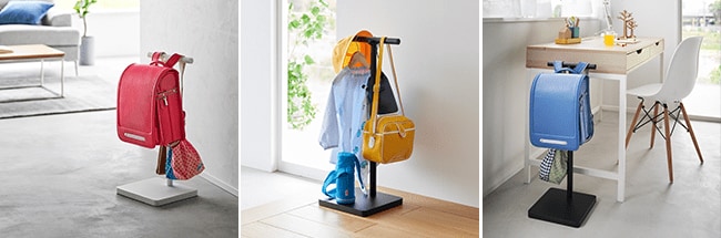 帽子や制服、手提げバッグなど、一緒にまとめておきたいアイテムをかけても安心!しっかりとした安定感がある点も魅力。ランドセルは、かけたまま、開いても大丈夫という使い勝手も考えられたアイテムです。
