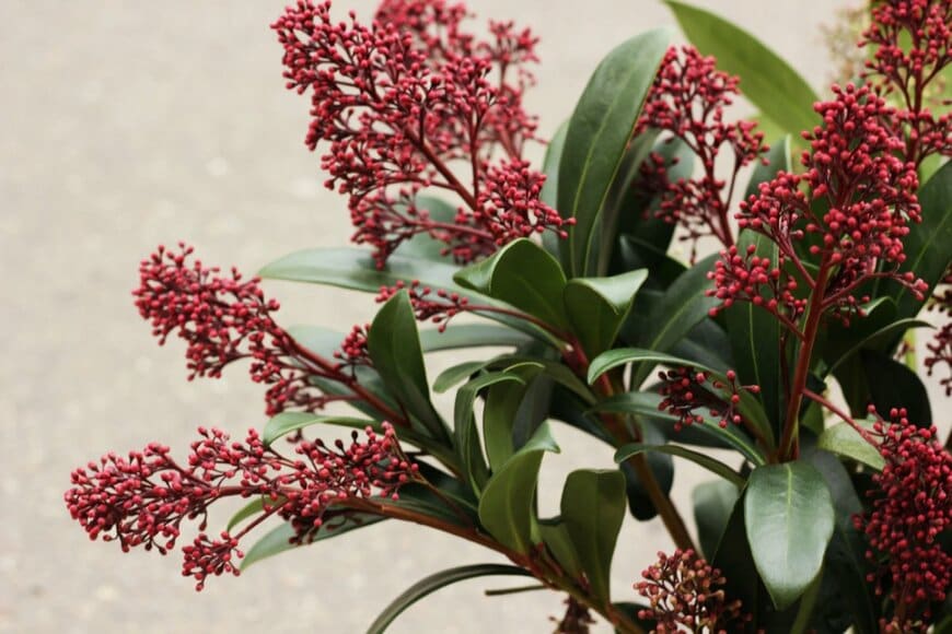 スキミアはダークレッドやホワイトのつぼみが可愛い常緑低木です。やや小さめのサイズで販売されていることもあり、寄せ植えにも重宝します。