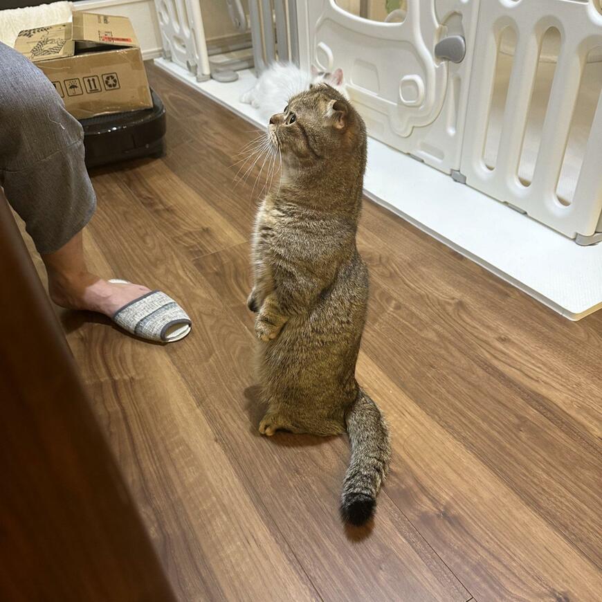 パパと遊びたい猫ちゃんの「ミーアキャットも驚きそうな催促姿」がX(旧Twitter)で注目を集めています。