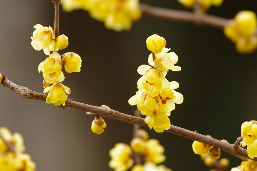 冬に、ロウ細工のような光沢のある花を咲かせるロウバイ。12~2月に開花し、黄色の花からは香りが漂います。お正月の枝ものとして販売されることもあります。