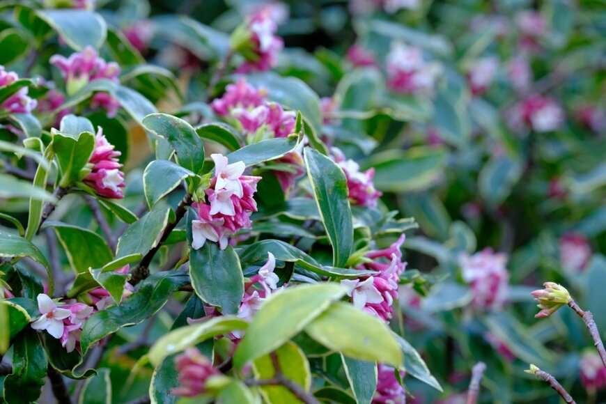 三大香木のひとつであるジンチョウゲは香りが楽しめる常緑低木です。開花期は2~4月までで、春の訪れを告げるかのように美しい花が咲きほこります。
