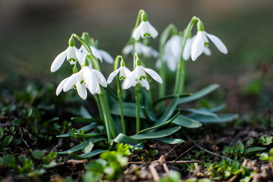 球根植物のスロードロップはホワイトの花が美しい多年草。透き通るような花色が冬景色に映え、清楚で可憐な花姿を楽しめます。