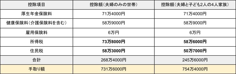 ケース①と②を比較すると、扶養控除対象の子どもが2人いる世帯の方が、22万8000円手取りが多くなっています。控除項目や控除金額が増えるほど、手取り額が増えることがわかります。