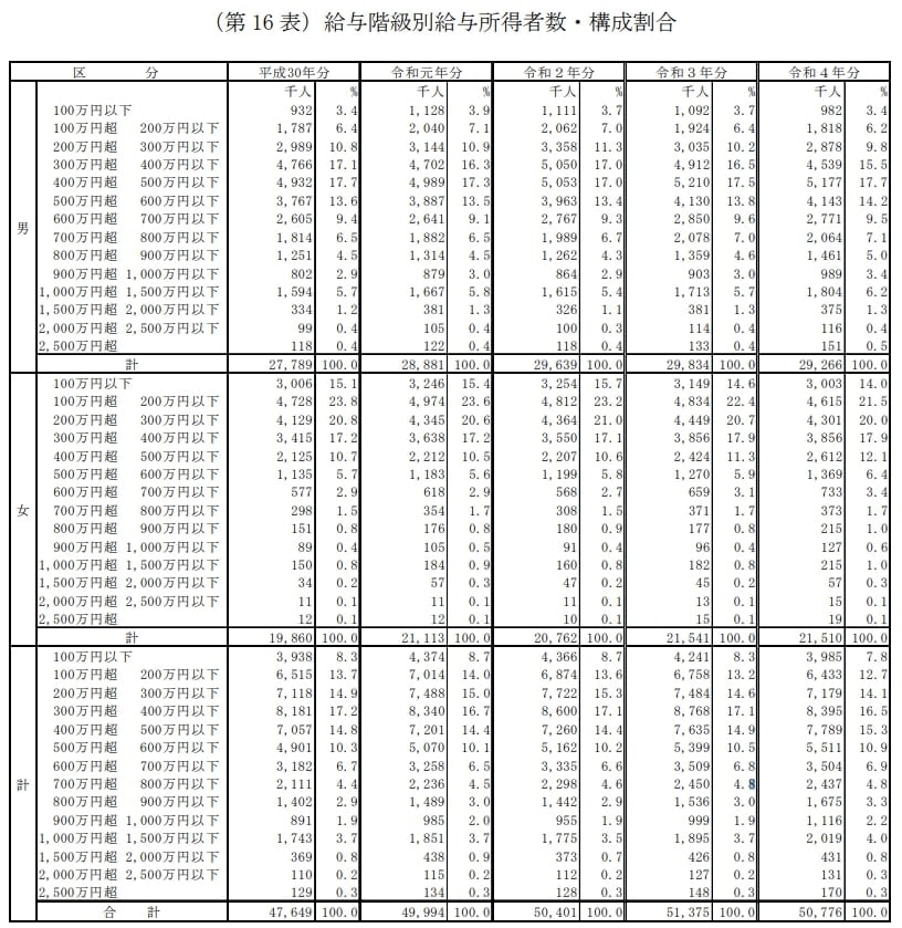 国税庁「令和4年分民間給与実態統計調査」によると、日本の給与所得者の年収分布は以下のとおりです。