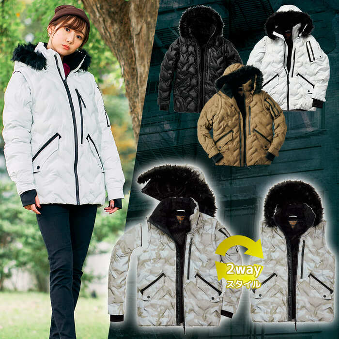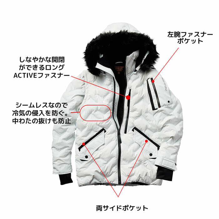 ワークマンの人気商品のひとつで、ミリタリーなスタイルをシンプルにまとめてくれるアイテム。縫い目のない特別な加工を施しているので、冷気の侵入や中わたの抜けを防ぐ優れもの。生地表面の反射コーティングにより、夜間の作業も安全にサポートします。