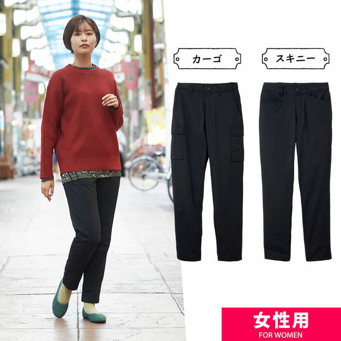 こちらのパンツは、シルエットが美しい「スキニータイプ」とポケットが充実している「カーゴタイプ」を選べます。複数回洗濯した場合も色落ちしにくいところがうれしいですね。防風素材を使用しているため、寒い時期の通勤時も安心です。