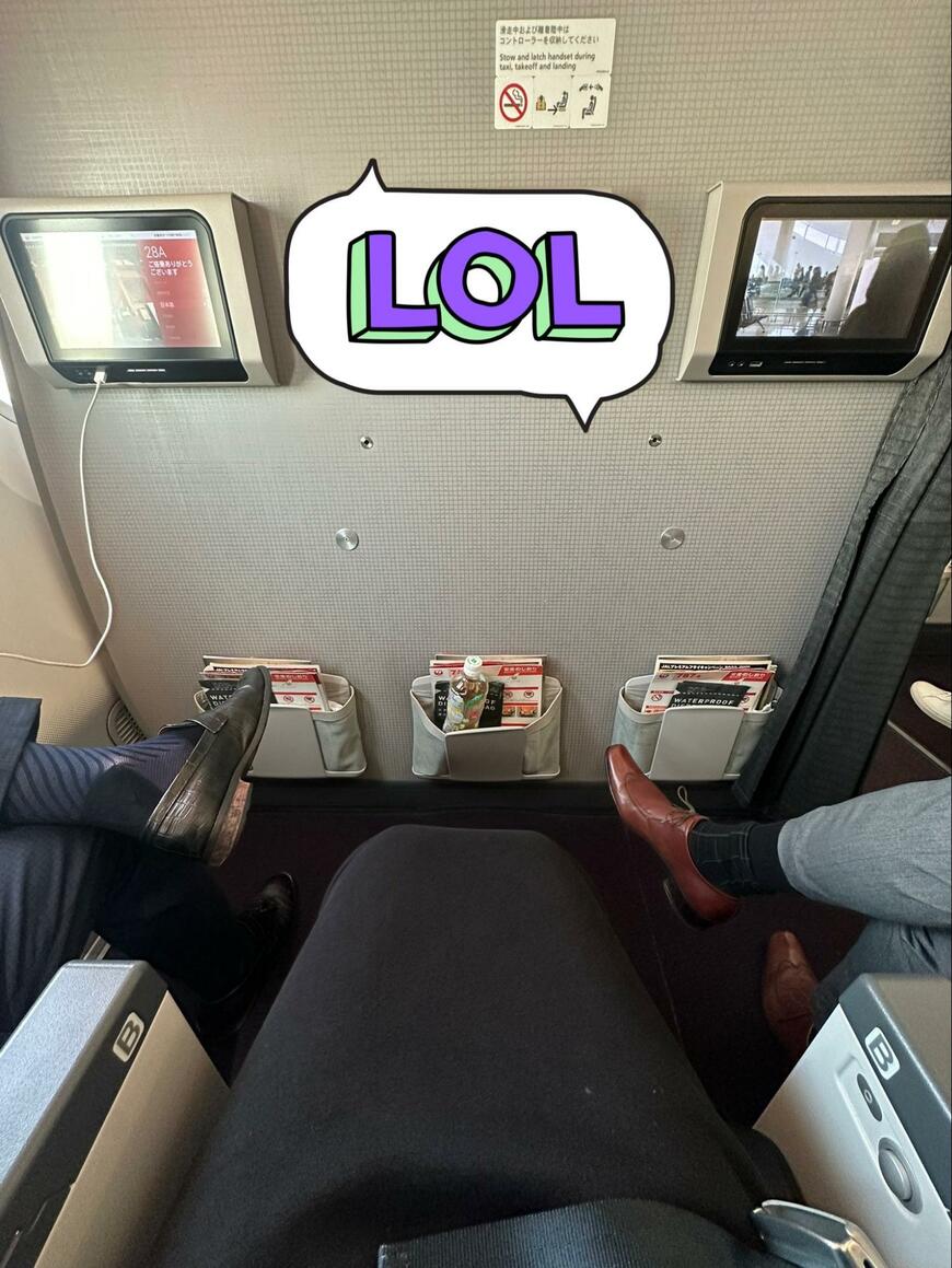 「笑うしかないんだけど両サイドのおぢが組んだ足は私の方向いてるし、肘掛けどっちも取られて肩身狭いし今日の席あまりにも人権なさすぎる」