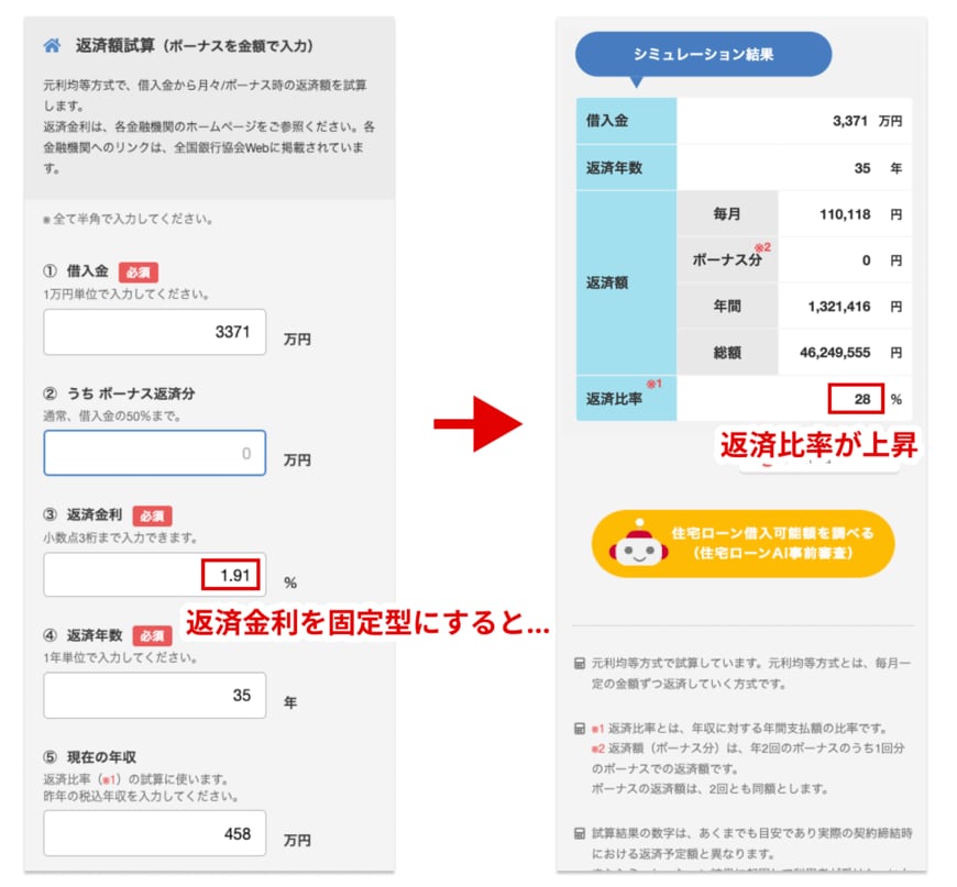 今度は金利タイプを固定型(フラット35の2023年12月時点の金利である1.91%に設定)にして、シミュレーションしてみましょう。この場合の返済額は毎月11万118円、年間132万1416円、総額4624万9555円という結果で、変動型より負担が大きくなっています。返済比率も28%まで上昇しています。