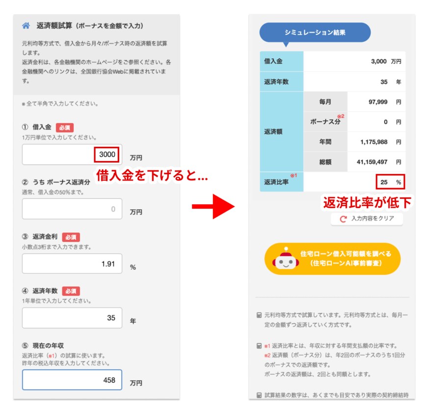 現在の年収で返済比率を無理のない範囲に抑えるためには自己資金を増やし、借入金を減らす必要があるので、借入金の項目を調整していくと3000万円であれば返済比率を25%まで抑えることができることが分かりました。