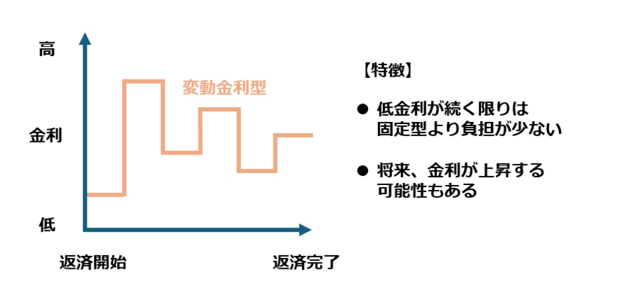 変動金利型は返済途中で金利が見直されるもので、低金利が続く限りは固定金利型より支払額の負担を減らせるのがメリットです。ただ金利が上昇すればそれだけ支払額は増額するというデメリットもあるため、もしもの金利変動リスクに耐えうるかということを考慮しておく必要があります。