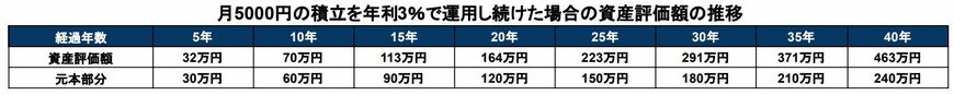 月5000円の積立投資を40年間続けたら、463万円もの資産を用意できます。元本は240万円のため、新NISAの利用で資産が約2倍に増えています。