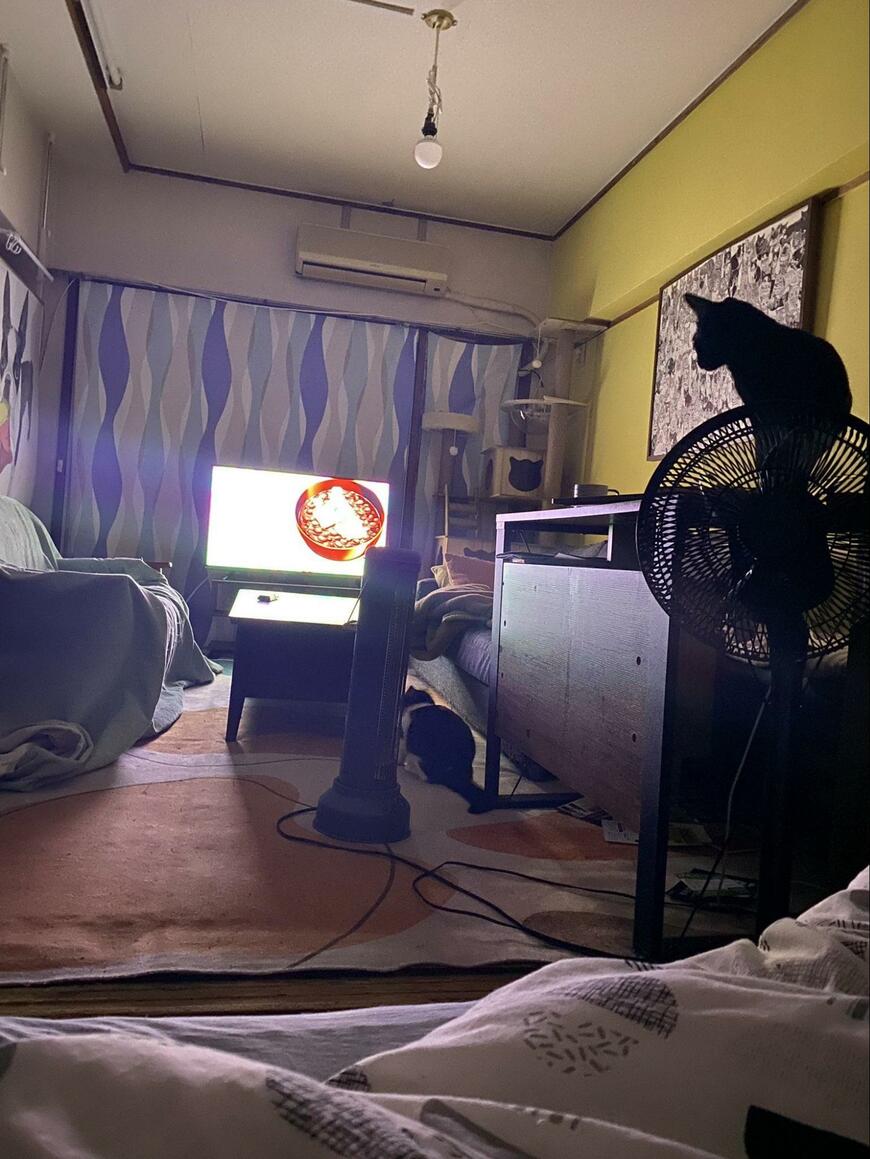 飼い主さんは3匹の猫ちゃんと暮らしており、写真をよく見ると、テレビの前には猫の女の子「モズク」ちゃんが写っていました。